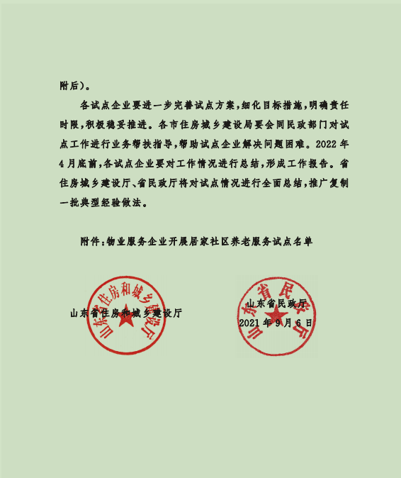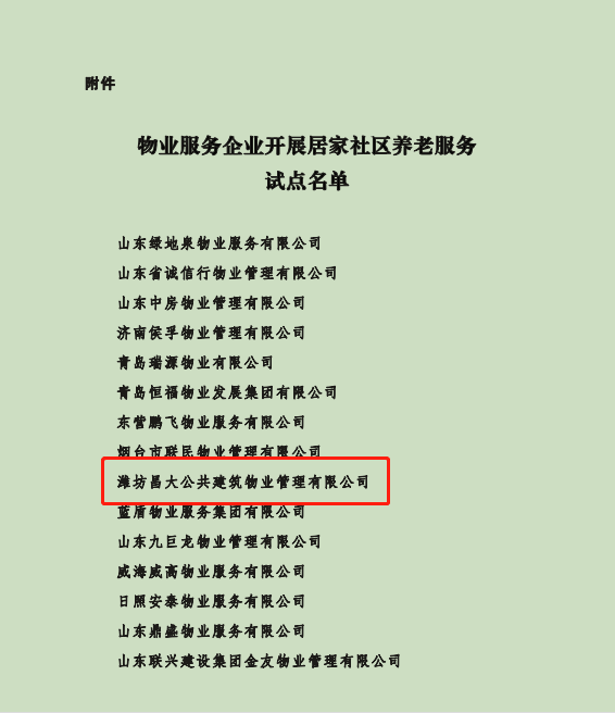 2021年9月6日,山東省住房和城鄉(xiāng)建設廳、山東省民政廳聯(lián)合公布了關于物業(yè)服務企業(yè)開展居家社區(qū)養(yǎng)老服務試點名單,我公司在首批試點名單之列。